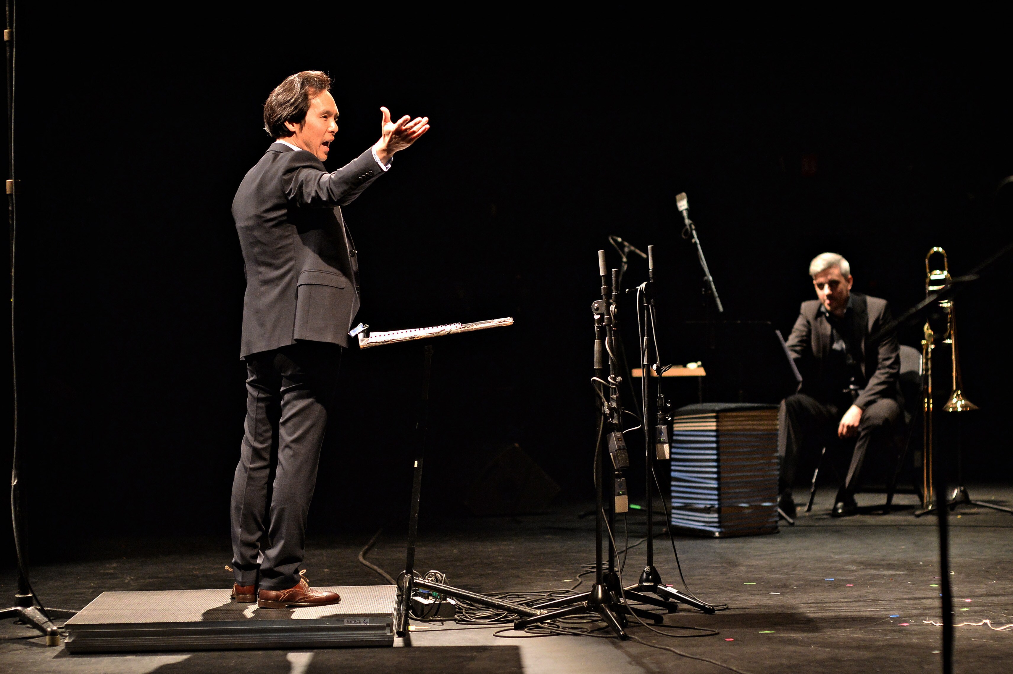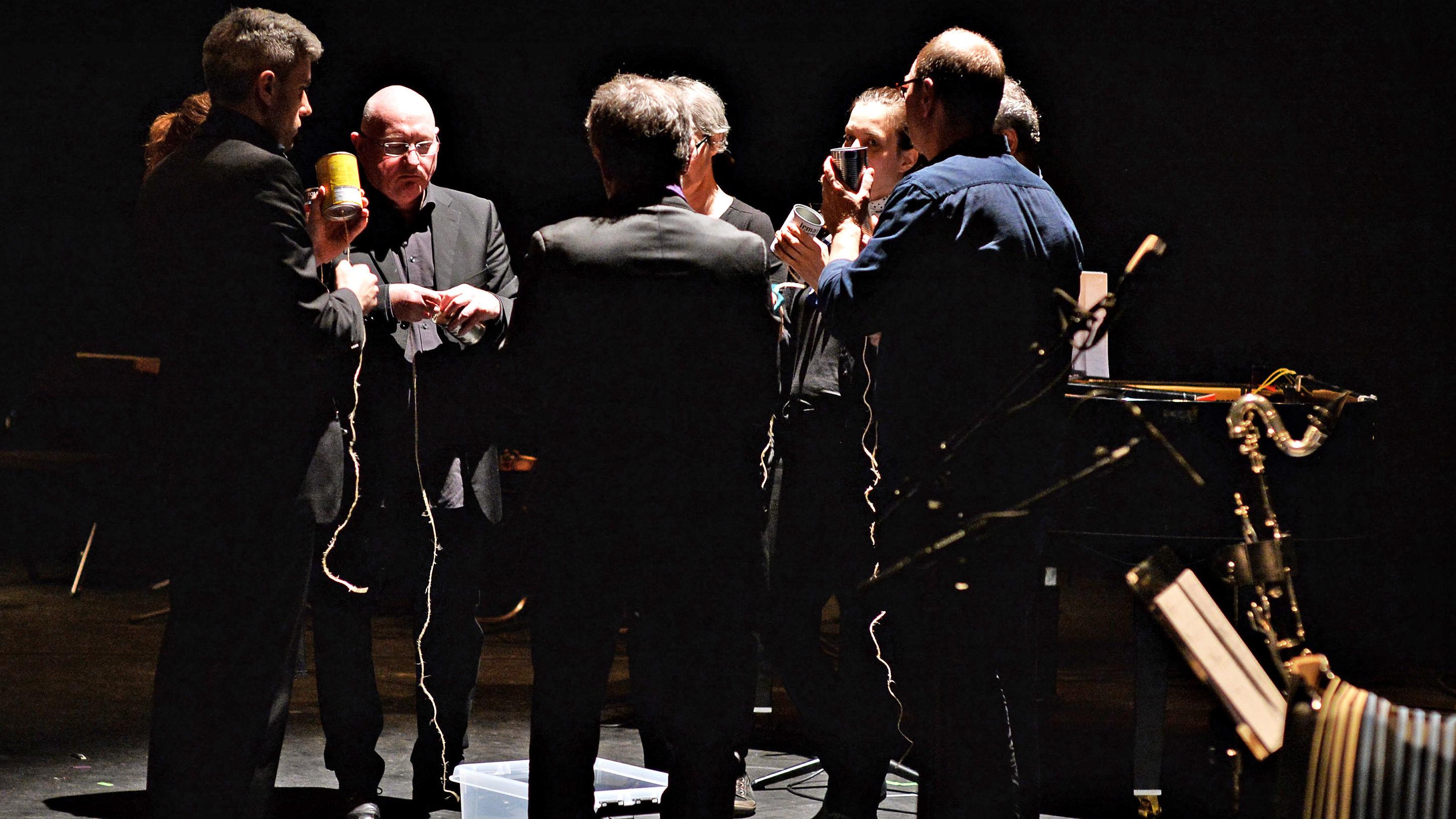 Musikerne i Klangforum Wien bevægede sig rundt på scenen i løbet af værket, og imiterede hinandens bevægelser. De havde små dåser og instrumenter lavet af pap, som de spillede på sideløbende med deres almindelige musikinstrumenter.