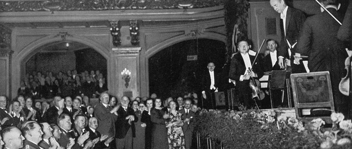 På et fotografi fra 1936 sidder ”Der Führer”, Adolf Hitler, nedenfor scenen i en koncertsal i Berlin.