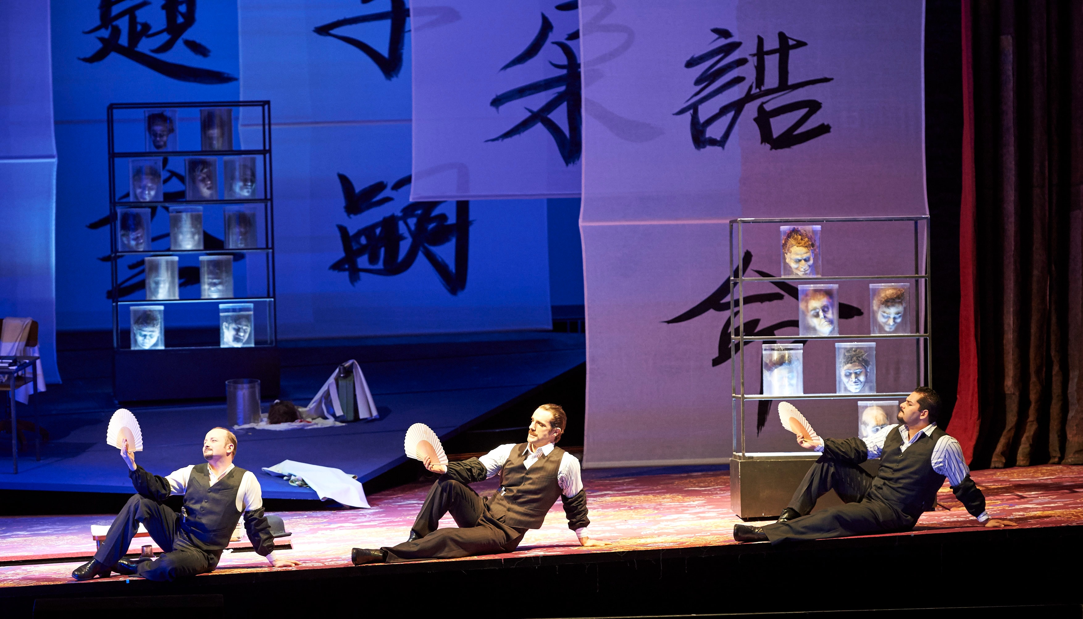 Ping, Pang og Pong forsøger at lokke Calaf fra sit forehavende med bestikkelse i form af skønne kvinder og penge, men Calaf er ikke til at rokke fra sin beslutning.