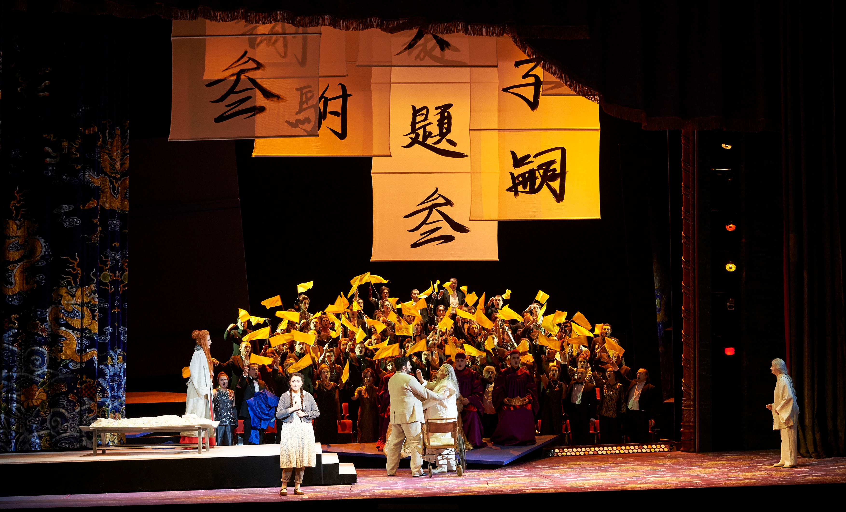 1.akt En offentlig plads i Peking En mandarin forkynder for folket, at prinsesse Turandot vil gifte sig med den mand af kongeligt blod, der er i stand til at løse hendes tre gåder, og at straffen for ikke at kunne besvare gåderne er henrettelse. Prinsessens seneste tilbeder er prinsen af Persien, og han kunne ikke besvare gåderne og står nu derfor overfor sin henrettelse.
