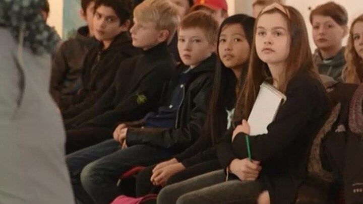 Cirka 150 skolebørn kigger rundt på hinanden med store øjne og åben mund.