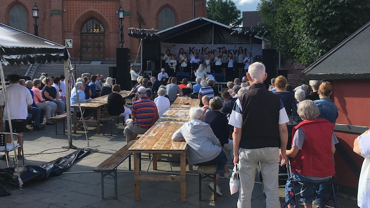 På torvet står folk begejstret og overværer et kor på scenen, der blæser igennem med deres sang og instrumenter. Musikken er bare en brøkdel af Kulturmødet.