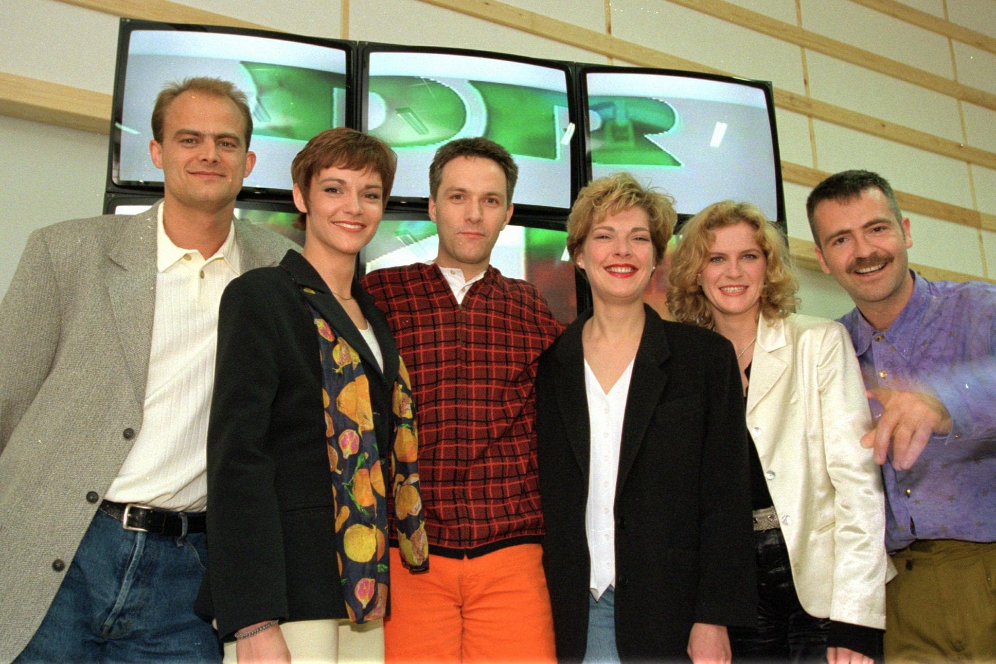 Da DR2 gik i luften for første gang i 1996, var det med disse seks nye tv-værter. Fra venstre: Kim Veirup, Anja Thordahl, Morten Jakobsaen, Eva Jørgensen, Inge Bang Termansen og Adrian Lloyd Hughes. (Foto: © MORTEN JUHL, (c) DR/Scanpix)