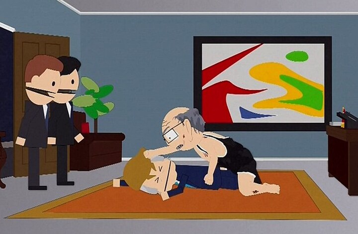 I det følgende klip ses karakteren Mr. Garrison først slå Trump i hovedet for derefter at wrestle ham i gulvet. Dernæst tager karakteren tøjet af, sniffer noget der ligner det euforiserende stof ’poppers’ - og påbegynder så en voldtægt af en skrigende og forfærdet Trump.