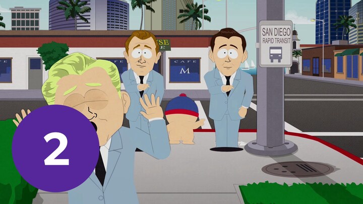 Sidstnævnte hændelse fik en hilsen med på vejen fra 'South Park', som sluttede en episode af ved at gøre præcis det samme, bare med karakteren Stan i stedet for Russell, til den her sang.