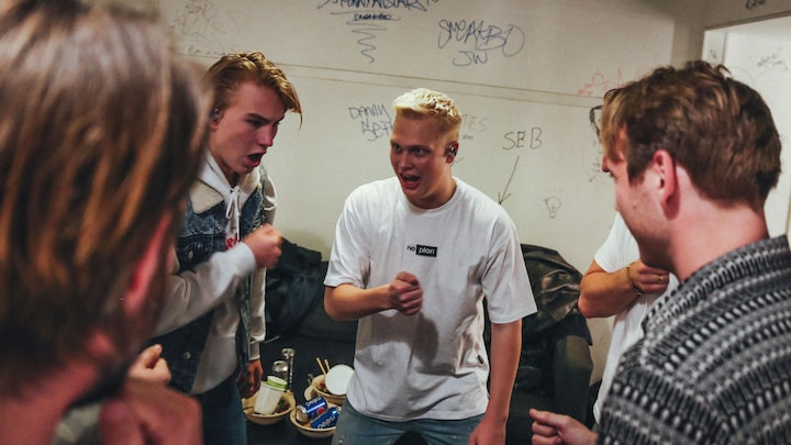 Der er nu ti minutter til, at de skrigende fans får deres idoler at se. De er blevet varmet op i tyve minutter af Lågsus-værterne. En vagt kommer løbende fra scenen ned mod backstageområdet.