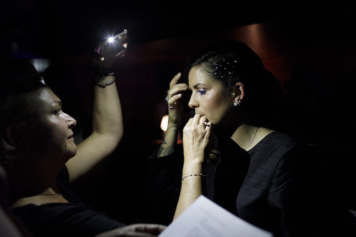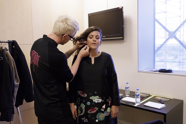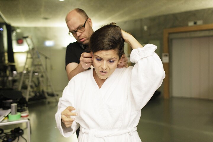 I et mørkt hjørne af Koncertsalen får Petra løbende lagt ekstra makeup på under showet.