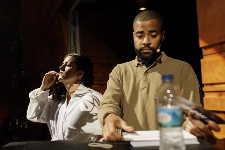 Før værtsprøven, hvor Petra og Andrew skal gennemgå deres manuskript, får Petra mikrofon på.
