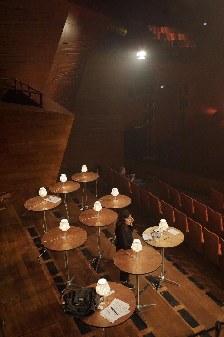 Et lille ophold under generalprøven bruges på at sidde blandt publikum.