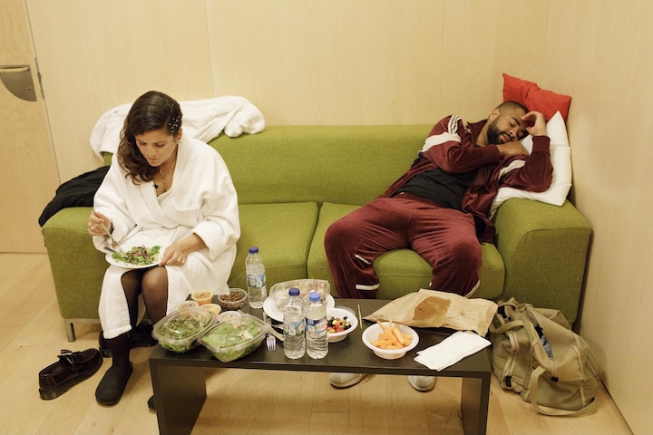 De to værter tager en pause og får sig lidt mad i en hektisk dag.