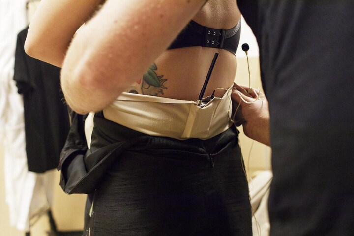 Lydteknikerne giver Petra hendes mikrofon på under kjolen.