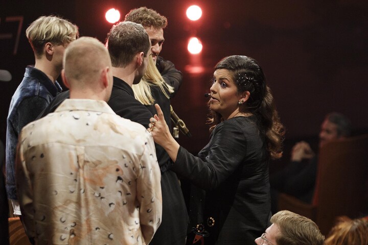 Petra lykønsker gruppen Scarlet Pleasure med prisen for P3 Lytterhittet.