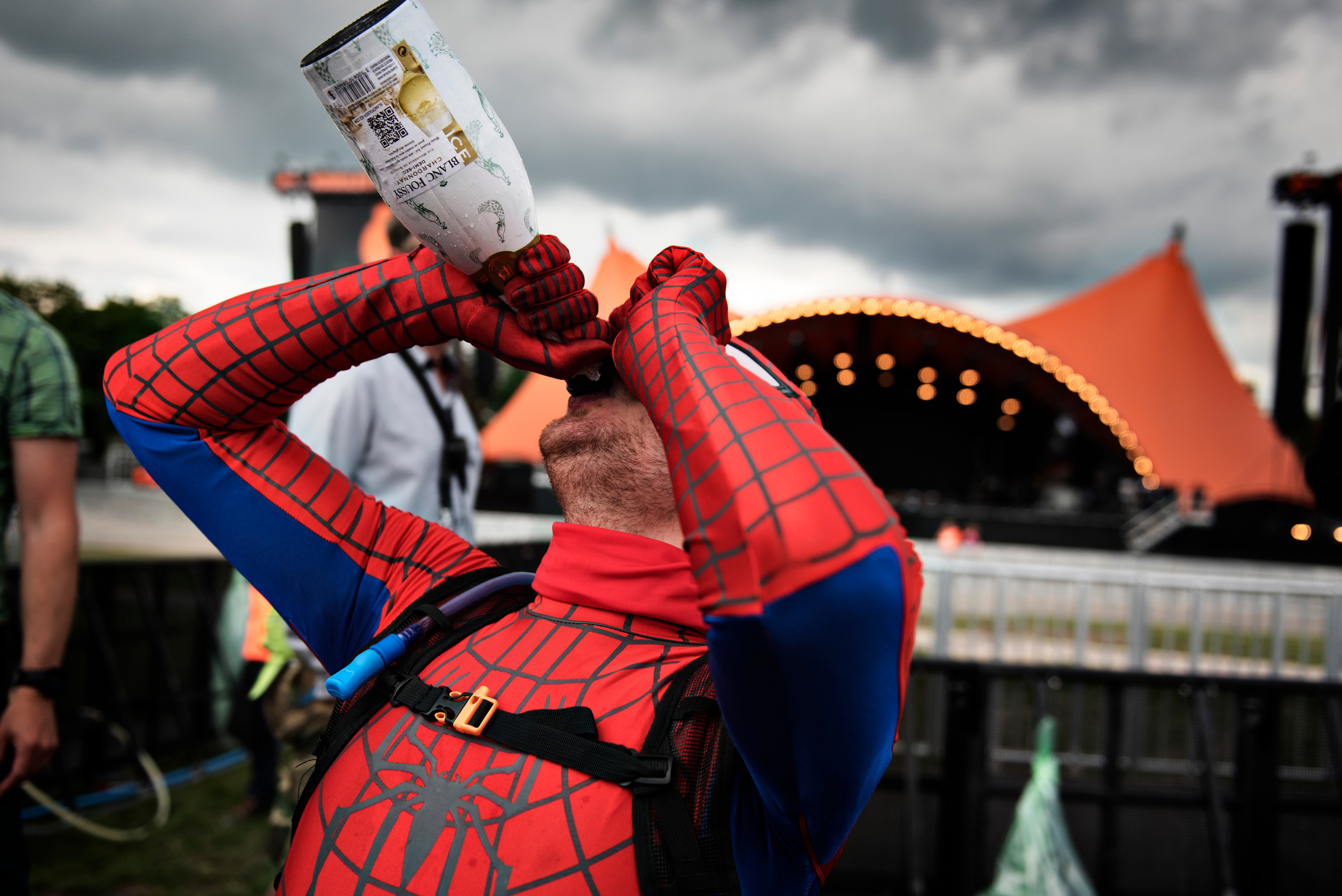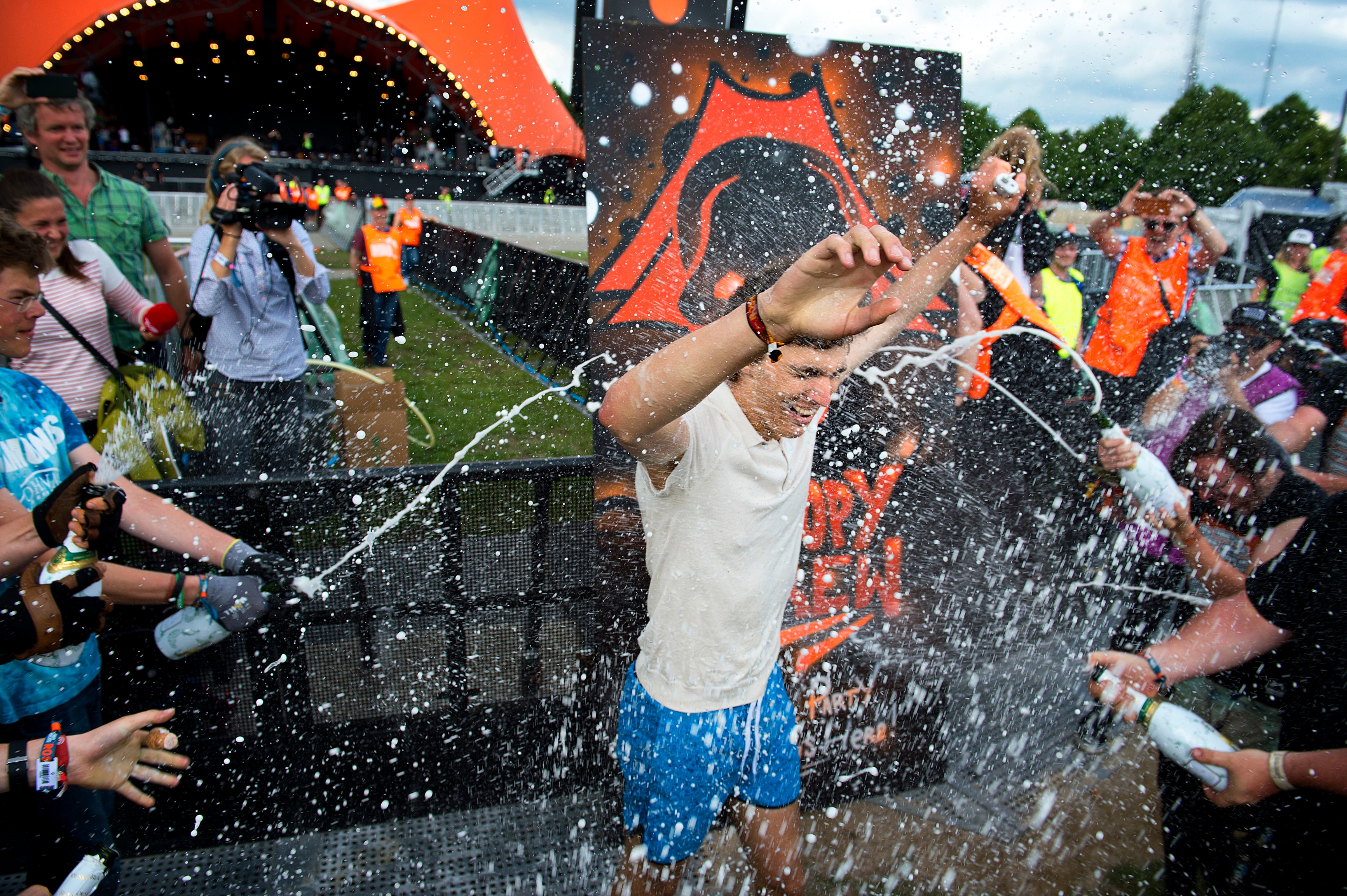 Første mand til Orange Scene vinder en festivelbillet til 2017. Oliver Zacho 22 år fra Roskilde aka Superman løb hurtigst da selve festivalområdet åbnede onsdag kl 17. Scenearbejderne fejrede ham med champagne. (Foto: © NILS MEILVANG, Scanpix)
