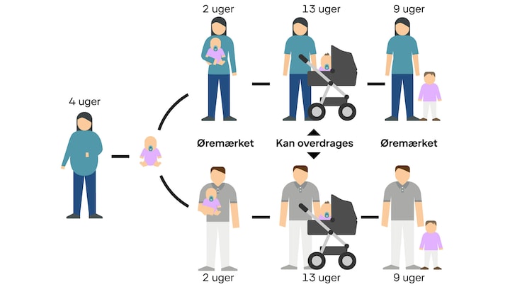 Helt overordnet har moren stadigt de fire uger før fødslen, og begge forældre har hver to uger efter fødslen.