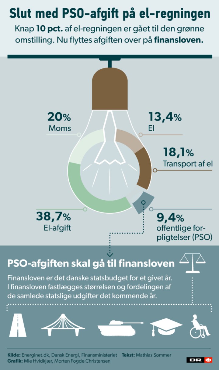 Derfor har et politisk flertal besluttet at flytte PSO-afgiften fra danskernes el-regning over på Finanslov. Finansiering skal blandt andet findes ved at hæve bundskatten.