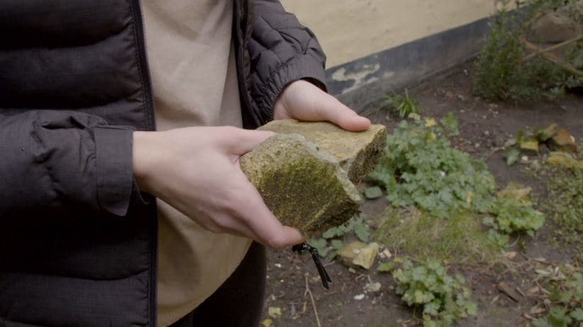 I en gårdhave i Nyborg ligger der for eksempel stadig murbrokker spredt, efter de faldt ned fra en gavl en sommeraften i 2019.