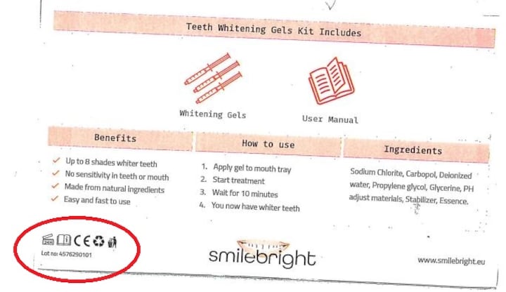 Det pågældende sæt havde LOT-nr. 4576290101, og så sent som 3. september – altså for lidt over tre uger siden – købte Kontant endnu et tandblegesæt fra SmileBright med samme LOT-nr.