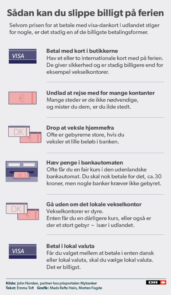 Desuden kan hverken banker eller vekselkontorer konkurrere med visa-dankortet på prisen. I banken er der gebyr på at veksle til udenlandsk valuta og også vekselkontorer kan være en dyr løsning, vurderer Mybanker-partneren.