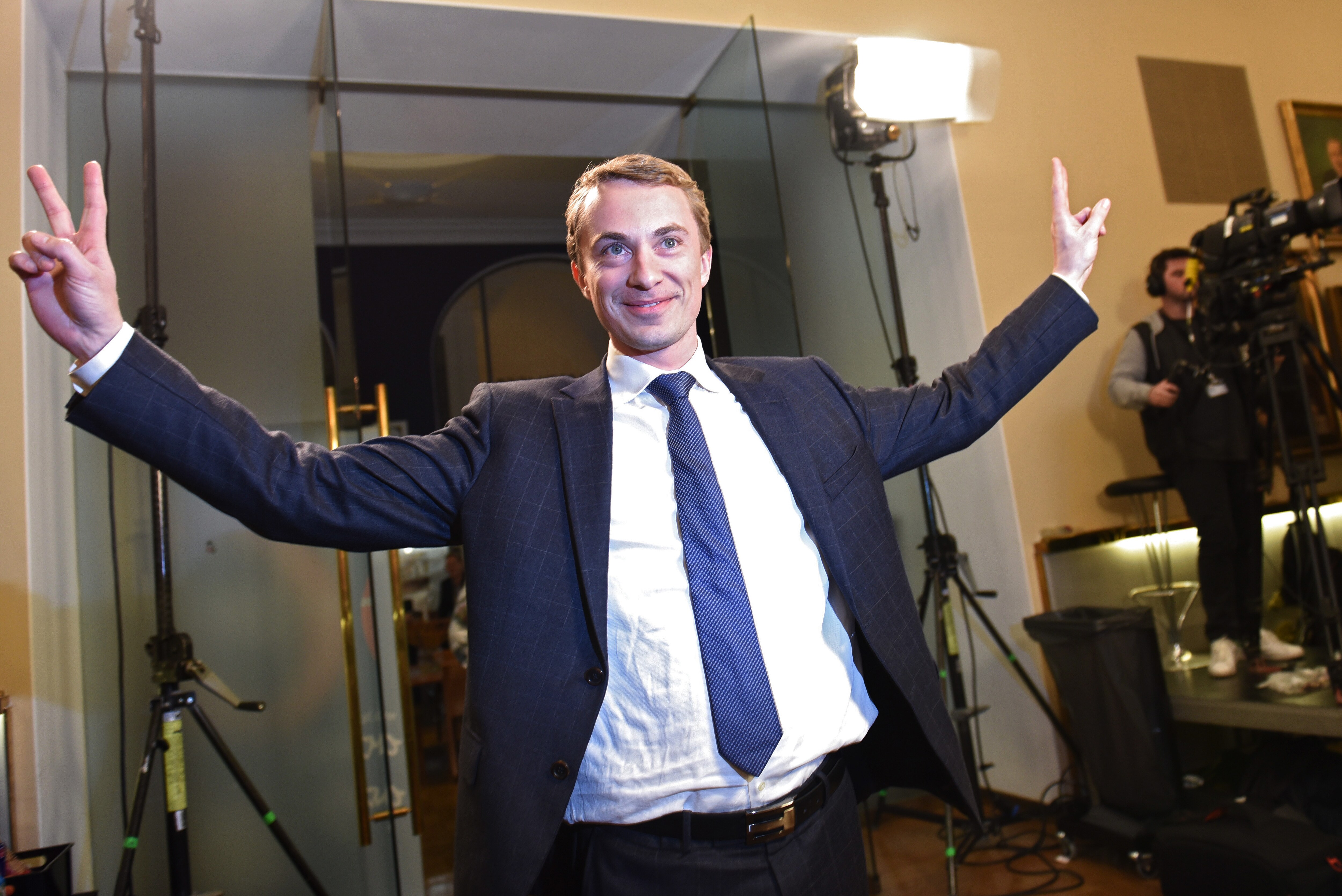 Dansk Folkepartis europaparlamentariker Morten Messerschmidt ankommer til DF's valgfest med håndtegn. (Foto: © Linda Kastrup, Scanpix)