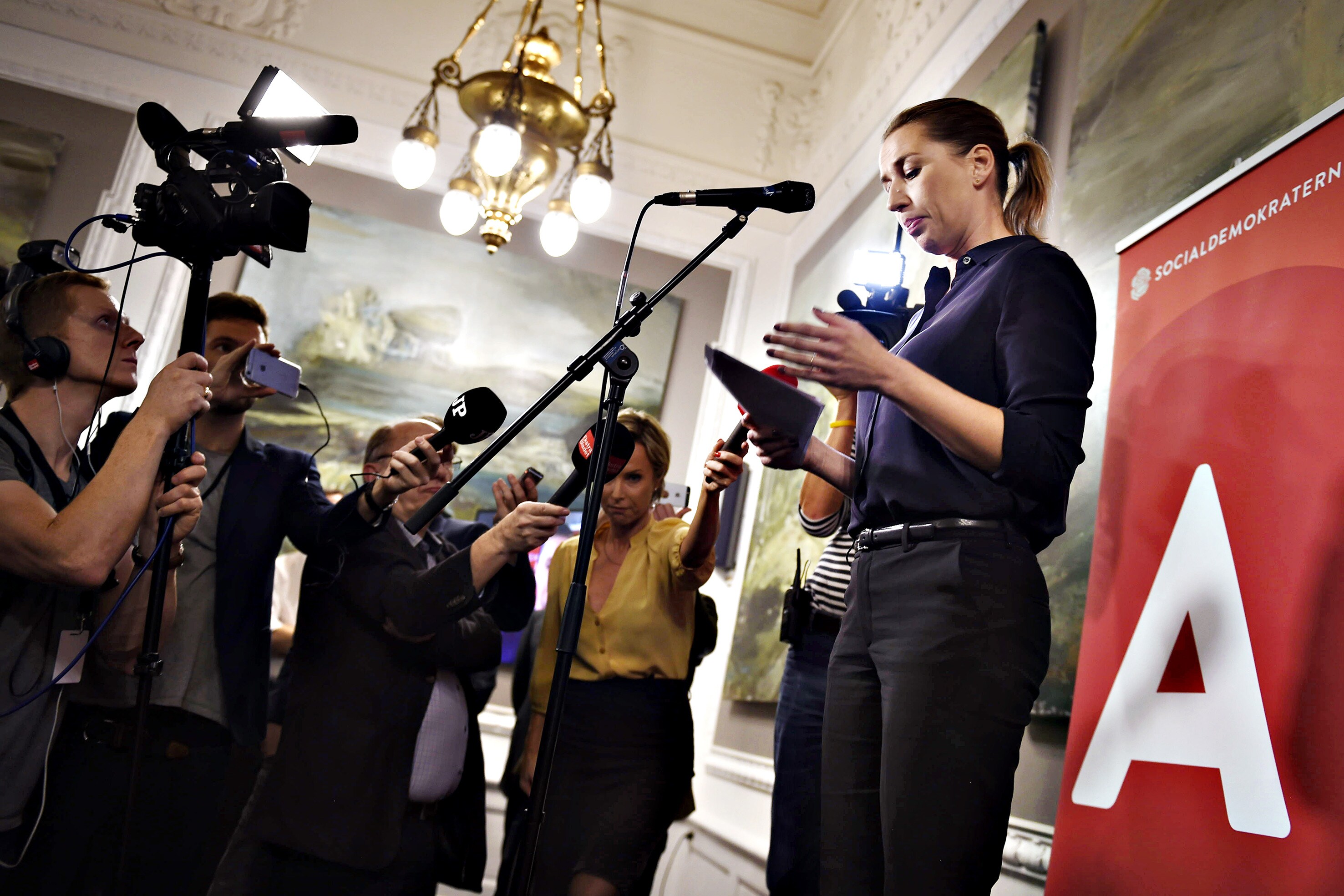 Hos de tabende ja-partier var stemningen, ikke overraskende, noget mere lavmælt. Her er det Mette Frederiksen, der, uden balloner og klapsalver, kommenterer på aftenens nederlag. (Foto: © liselotte sabroe, Scanpix)