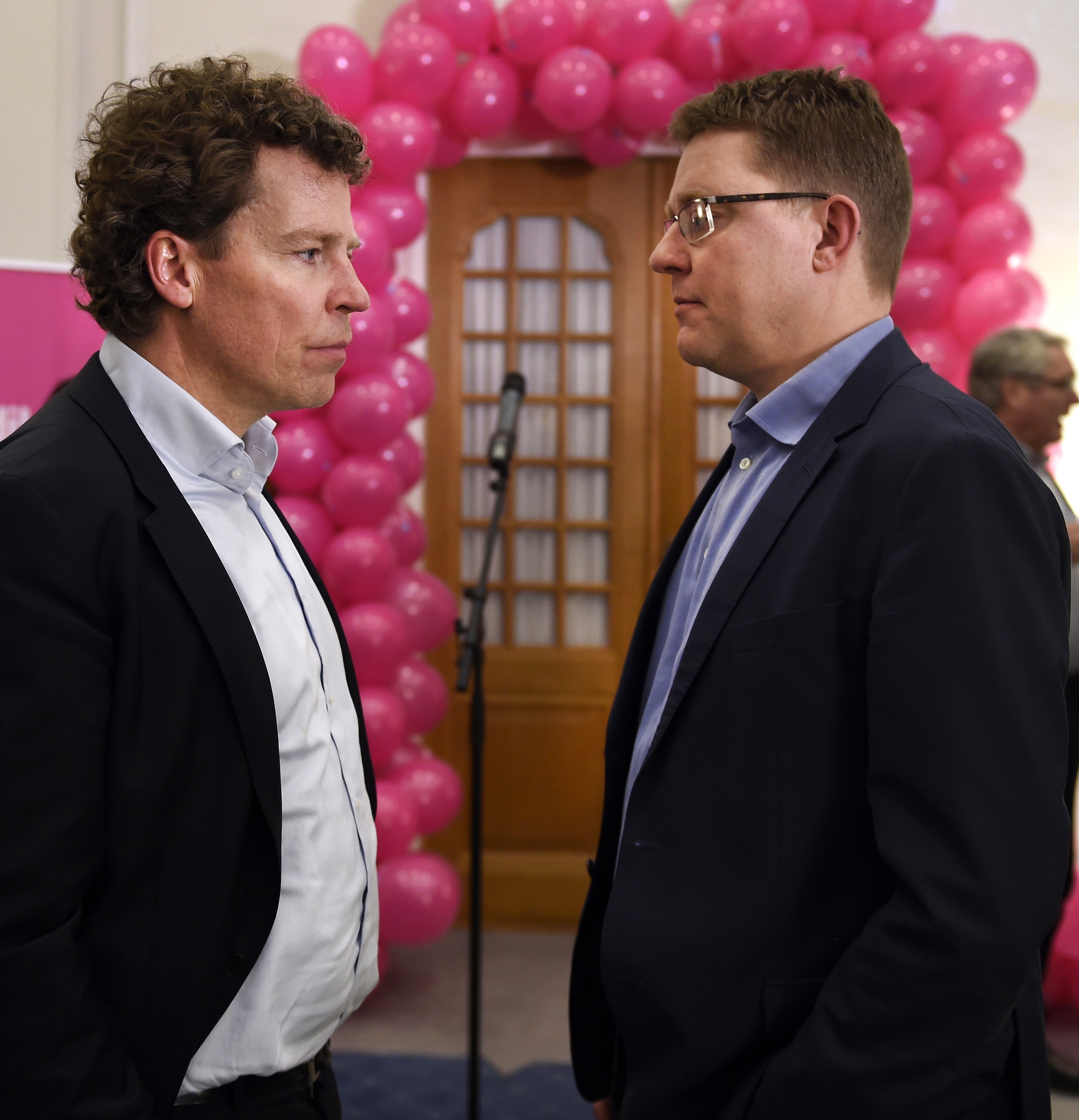 Selvom ballonerne var pustet op hos De Radikale, var der ikke meget feststemning at spore. Her er det forhenværende klima, energi- og bygningsminister Rasmus Helveg Petersen (tv.) overfor sin bror og medlem af Europaparlamentet, Morten Helveg Petersen. (Foto: © liselotte sabroe, Scanpix)