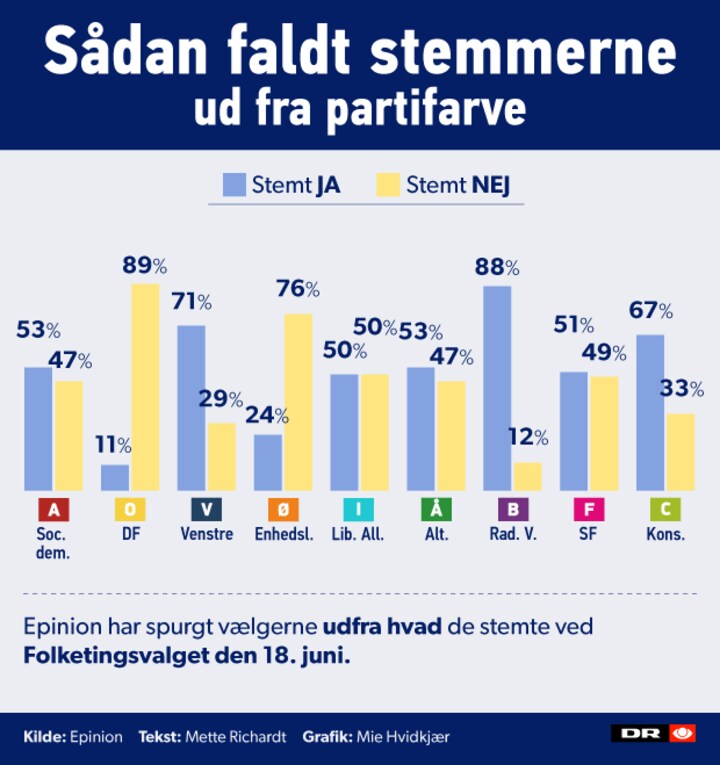 Hos nej-partiet Liberal Alliance har hele 50 procent stemt ja, og hos Venstre-tilhængere har knap 30 procent stemt nej.