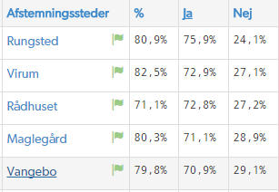 DR Nyheder har samlet en top fem-liste over, på hvilke afstemningssteder de fleste ja- og nej-stemmer faldt. Her fremgår det, at Sjælland huser de fem afstemningssteder i landet, hvor der blev afgivet flest ja-stemmer. Således topper Rungsted i Fredensborg Kommune, Virum i Lyngby- Taarbæk Kommune, Rådhuset, Maglegård i Gentofte Kommune og Vangebo i Rudersdal Kommune på ja-listen.