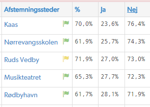 Opgjort i procentpoint er der ikke langt mellem de største ja og nej-steder. Hvor procentsatserne på de fem største ja-stemmesteder ligger mellem 70,9 og 75,9 fordeler procentsatserne sig mellem 71,9 og 76,4, på de afstemningssteder, hvor de fem største nej´er blev afgivet. For eksempel toppede afstemmningsstedet Kaas med 76,4 procent nbej-stemmer, mens ja-stemmerne i Rungsted landede på 75,9 procent.