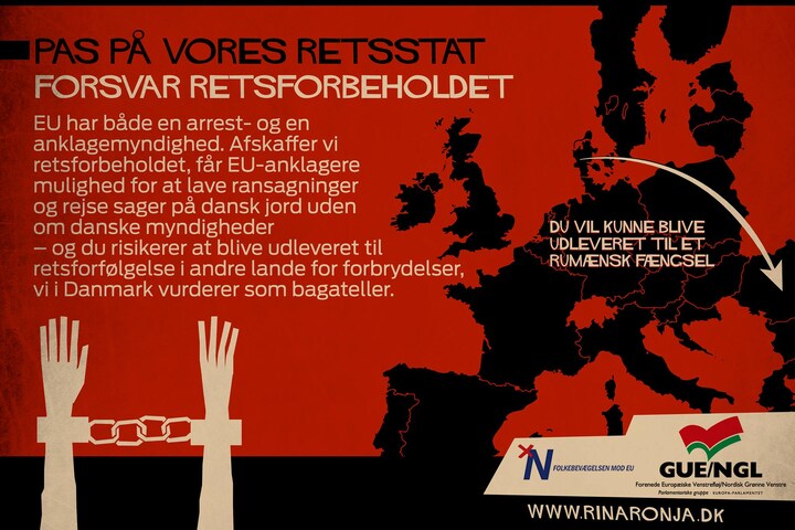 Bevægelsen argumenterer for, at en eventuel fælles europæisk anklagemyndighed og den europæiske arrestordre kan føre til, at danske borgere ville kunne blive udleveret til retsforfølgelse i andre i EU-lande.