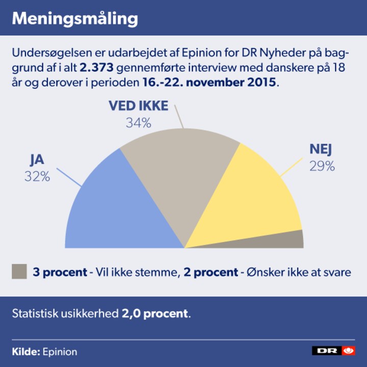 32 procent af vælgerne planlægger at stemme ja til at ændre retsforbeholdet til en tilvalgsordning, mens 29 procent vil stemme nej. 34 procent ved stadig ikke, hvor de vil sætte deres kryds den 3. december.