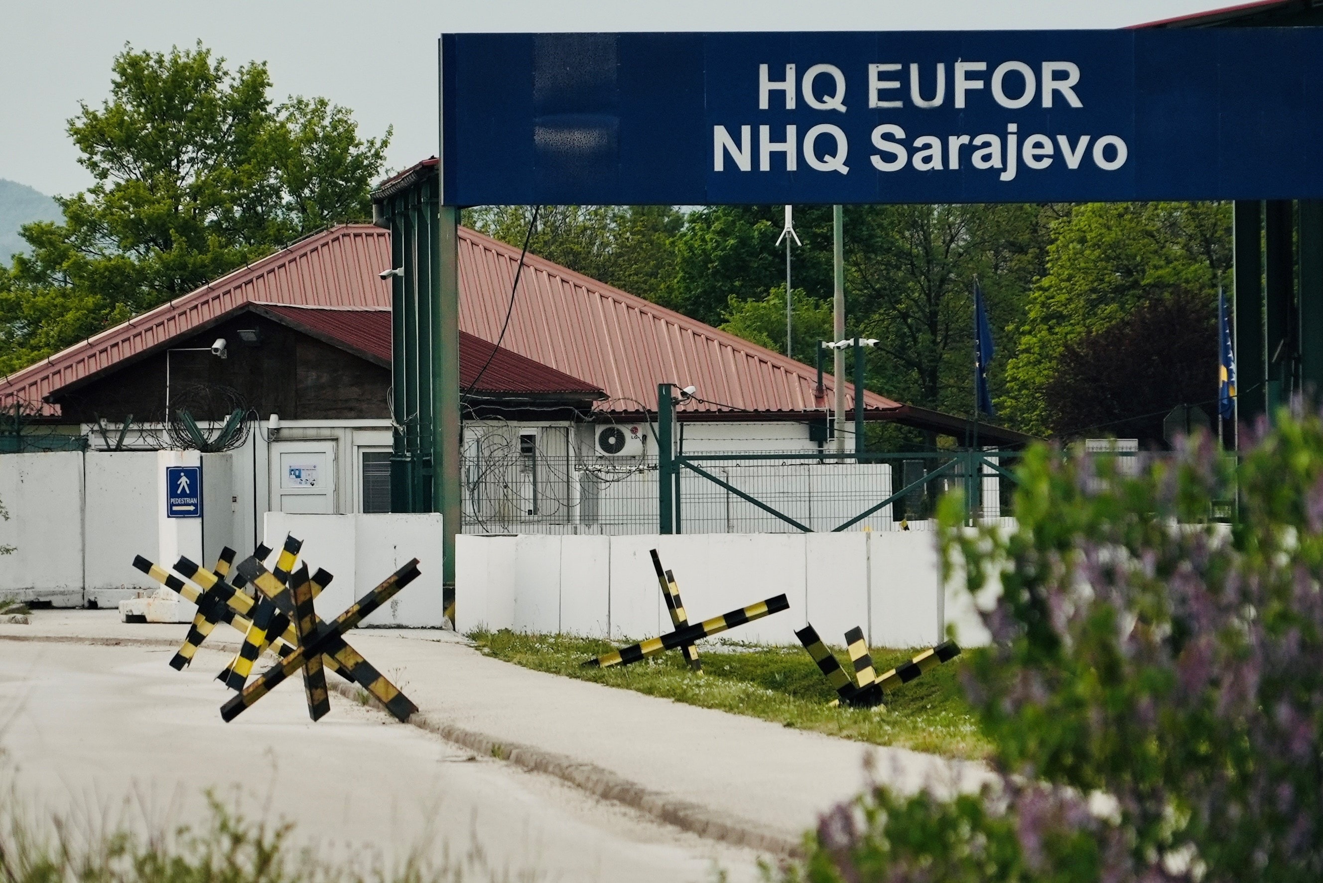 I begyndelsen var det Nato, der sørgede for, at fredsaftalen blev overholdt. I 2004 overtog EU opgaven. Godt et kvarters kørsel fra Sarajevos centrum - over bakkerne, hvor store skilte fortæller, at man nu kører ind i den serbiske del af Bosnien-Hercegovina, 'Republika Srpska' - ligger EU-styrkens hovedkvarter.