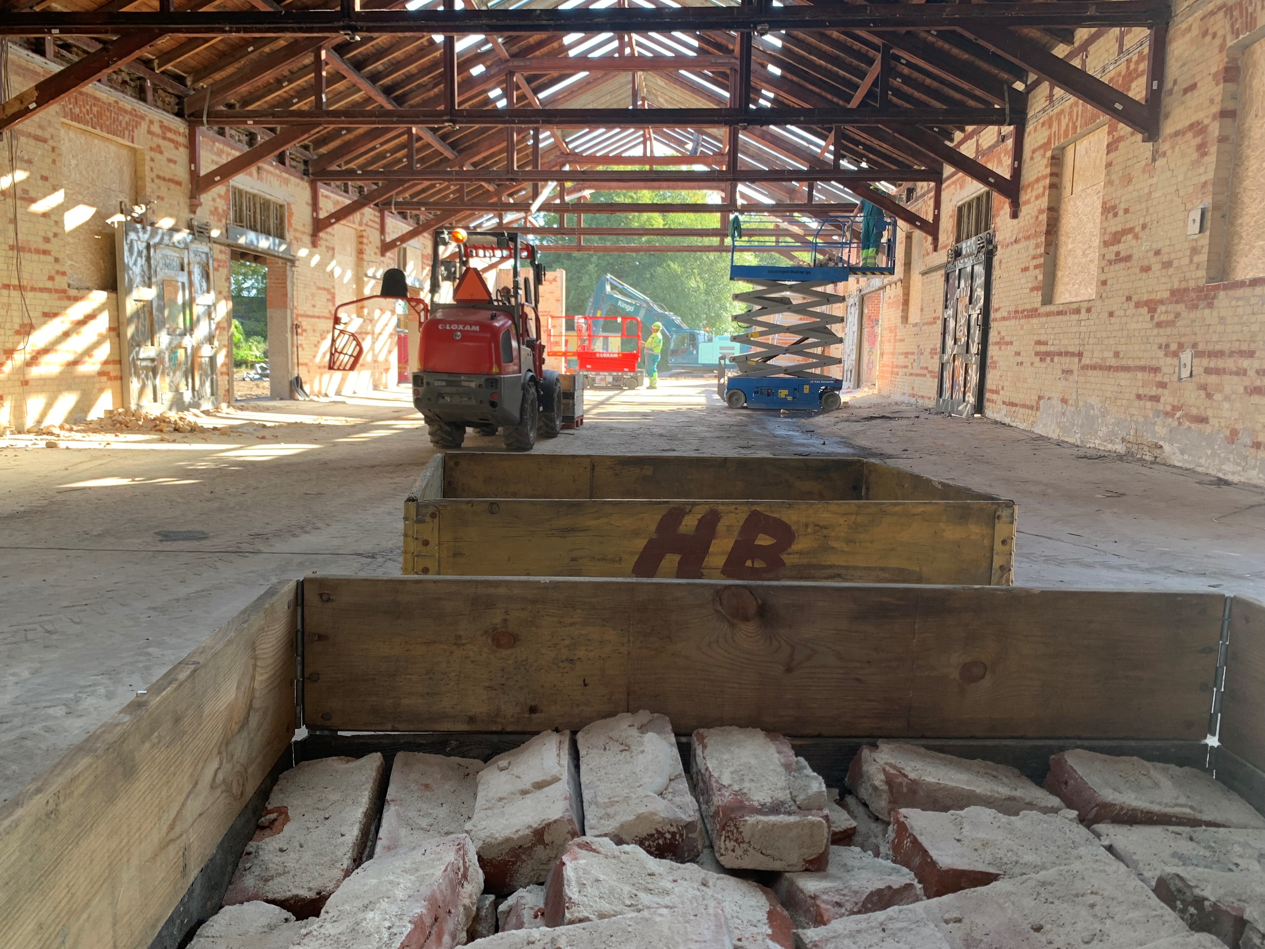 En flok mænd i gule veste og sikkerhedshjelme er lige nu i gang med at skille den gamle godsbanebygning i Vejle ad.