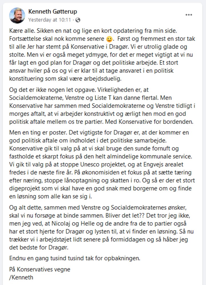 - Mit fokus ligger på de politiske forhandlinger. Det er altså politikken for Dragør i de næste fire år, der er vigtigst for os, frem for at tilfredsstille alle mulige spørgsmål fra pressen, siger Kenneth Gøtterup.