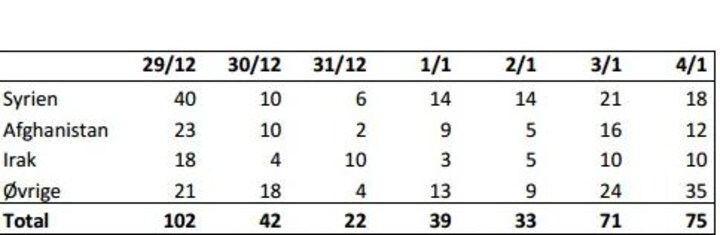Udlændinge- og Integrationsministeriet oplyser, at af de 75 asylansøgere kom 18 fra Syrien, 12 fra Afghanistan, 10 fra Irak og 35 fra øvrige lande.