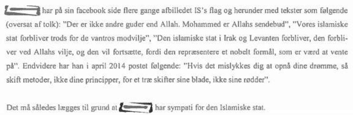 Manden har eksempelvis afbildet Islamisk Stats flag på sin Facebook flere gange samt skrevet tekster som 'Vores Islamiske Stat forbliver trods for de vantros modvilje' og 'Vores Islamiske Stat i Irak og Levanten forbliver, den forbliver ved Allahs vilje, og den vil fortsætte, fordi den repræsenterer et nobelt formål, som er værd at vente på.'