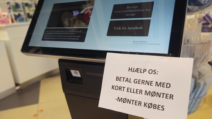 For når man træder ind i apoteket, bliver man mødt af en seddel med ordene: ’Hjælp os: betal gerne med kort eller mønster – mønter købes’.