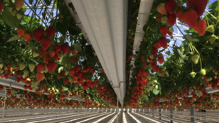 Jordbærrene hænger ned fra væksthuset i lange lige rækker, og der er nok af modne bær, der kan spises.