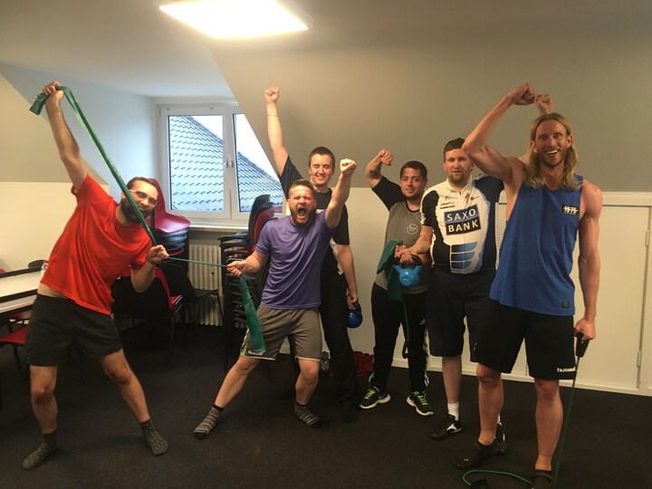 De 16 medarbejdere hives op af stolen og væk fra skærmen to gange om ugen af en halv times varighed for at forebygge arbejdsskader, mindske sygefravær og styrke sammenholdet.