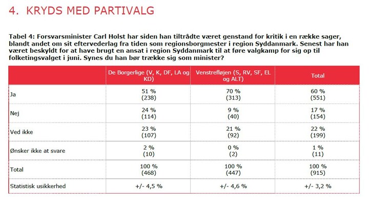 Målingen fra Epinion viser desuden, at 51 procent af de vælgere, som stemte på partier i den borgerlige blok ved sommerens folketingsvalg, mener, at Holst bør gå af.