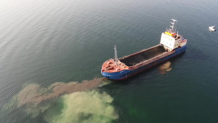 Sådan ser det ud, når en pram dumper flere hundrede tons slam i Køge Bugt. DR var til stede, da det skete den 23. marts 2022. Optagelsen her er lavet af Klimabevægelsen.
