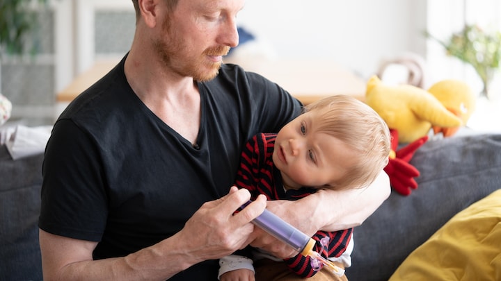 Når Vilhelm skal have mad, fylder forældrene en plastiksprøjte op og trykker den flydende mad igennem et plastikrør ind til hans sonde i maven.