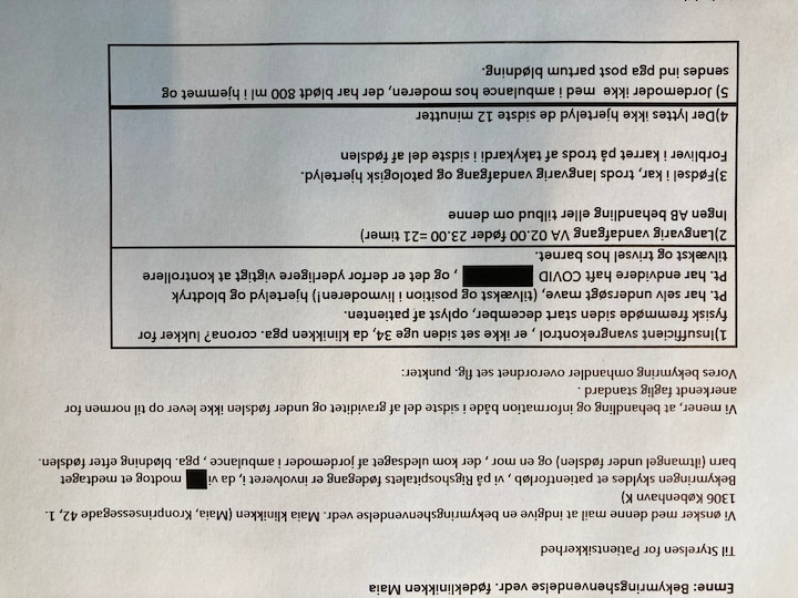 Til Styrelsen for Patientsikkerhed forklarer jordemoderen, at hun på grund af COVID-19 restriktionerne ikke kunne komme med ind på hverken traumecenteret eller neonatal-afdelingen. Det har ikke været muligt for DR at få jordemoderen til at uddybe dette.