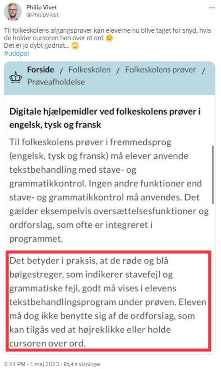 - Det vil jo kræve, at der skal stå en lærer og holde øje med elevernes mus under hele prøven. Det kræver kun, at de kommer til at holde musen hen over et ord - så er det snyd, siger Philip Vivet.