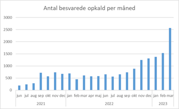 Digitaliseringsstyrelsen oprettede i sommeren 2021 en hotline, som skal hjælpe borgere, der har mistanke om identitetstyveri. Det seneste år er antallet af henvendelser steget støt, og i begyndelsen af i år har det for alvor taget fart med en stigning fra 1500 henvendelser i februar til 2600 i marts.