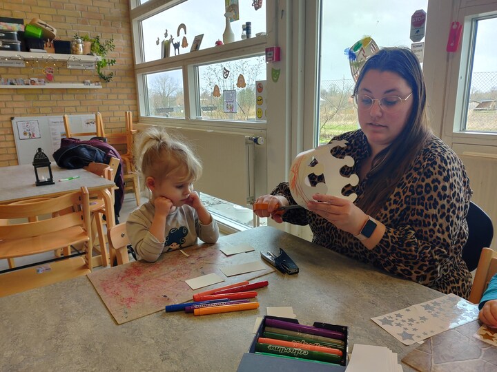 Alina øver sig i vuggestuen på at sige farverne på dansk, mens hun tegner. I dag, et halvt år efter hun begyndte, er der sket store fremskridt, fortæller Vivian Nielsen, som er pædagog på Alinas stue.