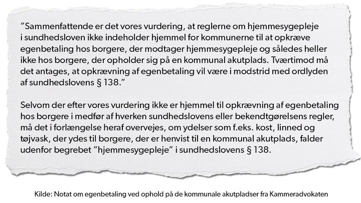 Kommunernes Landsforening har hævdet, at det var i orden at opkræve brugerbetaling for mad og tøjvask, fordi det er en ydelse efter serviceloven. Men det afviser kammeradvokaten, der slår fast, at sundhedslovens paragraf 138 meget klart siger, at ydelsen skal være vederlagsfri.