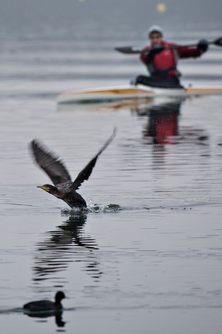 Skarven, der er en fredet fugl, skræmmes væk med råb, klap og gule veste.