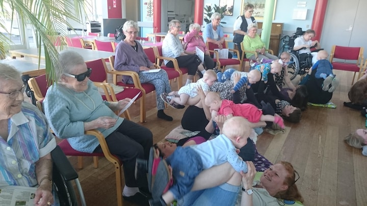 Forestil dig et lokale på et plejecenter, hvor ældre mennesker sidder side om side med nybagte mødre med babyer i favnen, imens de synger salmer i fællesskab.