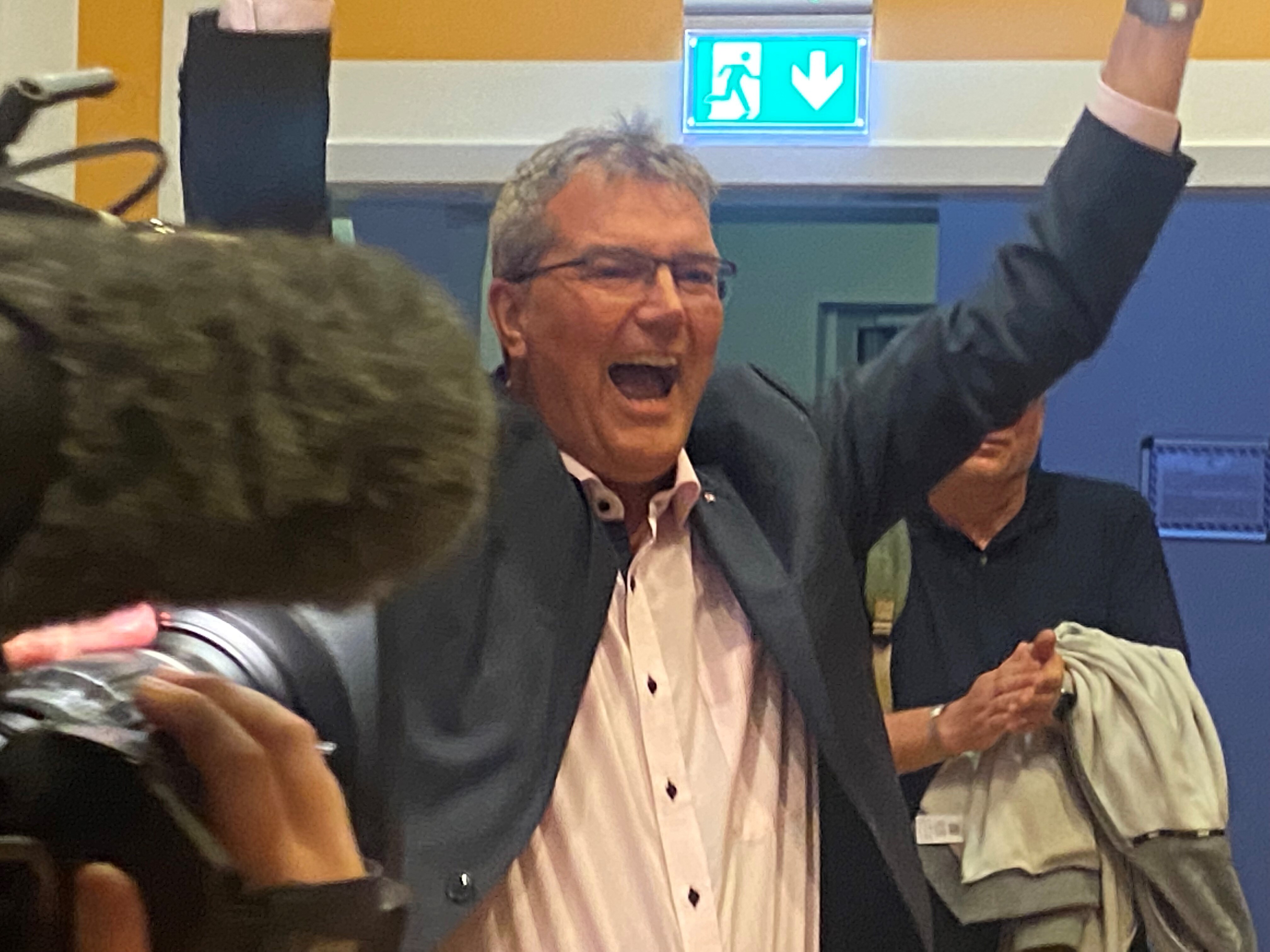 Da resultatet senere viste sig at komme op på hele 5,7 procent, var det partiets spidskandidat, Lars Harms, der havde svært ved at holde begejstringen inde i sin krop. Så han måtte også lade jublen ses gennem spjæt med både arme og ben.