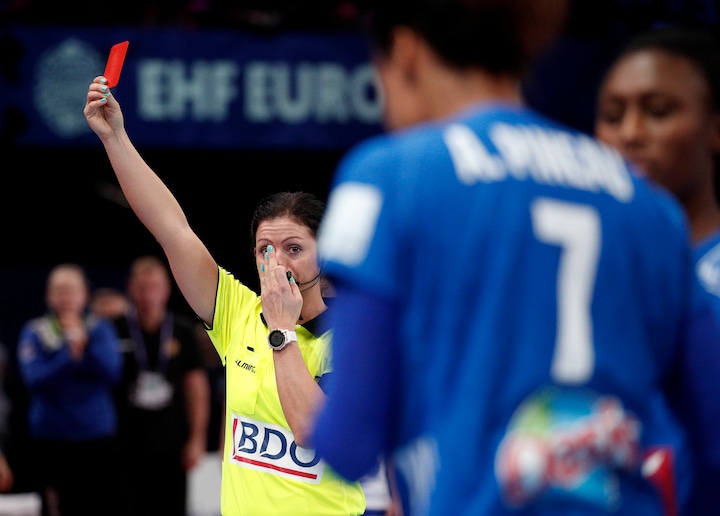 Fem minutter inde i anden halvleg i EM-finalen mellem Frankrig og Rusland for to uger siden hev Karina Christiansen det røde kort op af lommen.